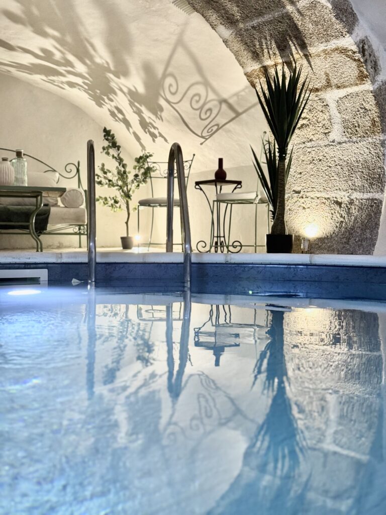 Les extérieurs dévoilent un jardin privé aménagé pour les repas en plein air (mobilier de jardin, barbecue Weber, parasol). Au sous-sol, une piscine intérieure chauffée nichée dans une cave voûtée offre un moment rare et intimiste, accessible par une porte sécurisée.